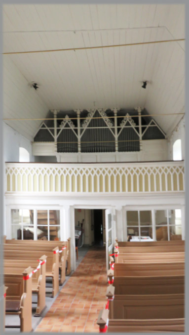 Das Innere der Kirche ist geprägt durch viele Einbauten, die vermutlich aus praktischen Gründen erfolgten, nun aber das Gesamtbild und die Raumathmosphäre erheblich beeinflussen. So stören z.B. der sich direkt neben dem Altar befindliche Ölofen mit einem langen schwarzen Ofenrohr, der sich an die Ostwand anlehnende Verschlag mit einem Ölbehälter und ein dunkel wirkender Altarraum empfindlich den ahnbaren ursprünglichen Raumeindruck. Der Altar ist aus Sandstein und entstand 1859. Deutlich heben sich die zu DDR- Zeit im Fußboden verlegten glasierten Spaltklinker ab. Alle Fenster haben eine Bleiverglasung in Oktogonstruktur. Mit Blick von dem Altar zur Orgelempore ergibt sich ein erheblich stimmigerer Eindruck. Die Brüstung der Orgelempore harmoniert mit dem Kanzelschild, die Bankfarbe mit den Fußbodenplatten. In dieser Blickrichtung erscheint die Kirche hell und einladend. Die Orgel wurde vermutlich 1907 eingebaut. Unter der Orgel befindet sich eine sog. Winterkirche. Im Eingangsbereich sind noch einige der originalen Fußbodenplatten verlegt.