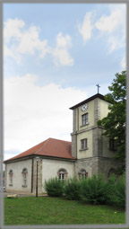 ziegelbelegten Walmdach. Der quadratische Turm ist leicht in den Baukörper des Kirchengebäudes eingschoben und schließt mit eine Dachfläche ab,