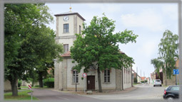 welche eine stumpfe Pyramide darstellt. Der Turm ist in 3 Segmente untergliedert, den unteren Teil, welcher eine Sakristei beherbergt, den mittleren Bereich,